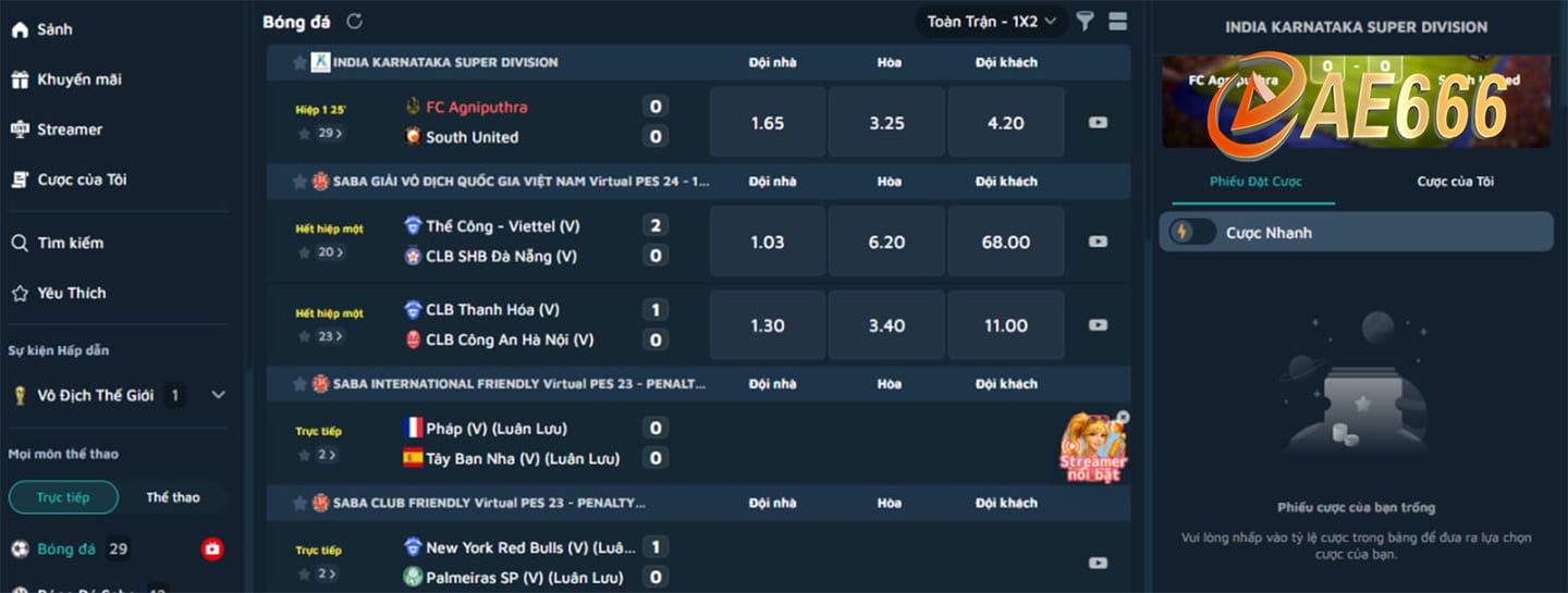 AE666 nổi bật với khả năng update kèo cược liên tục từng giây, giúp hội viên nắm bắt kịp thời biến động trong trận đấu. Điều này rất quan trọng trong các trận đấu có diễn biến nhanh, giúp người chơi đưa ra quyết định định cá cược đúng đắn.